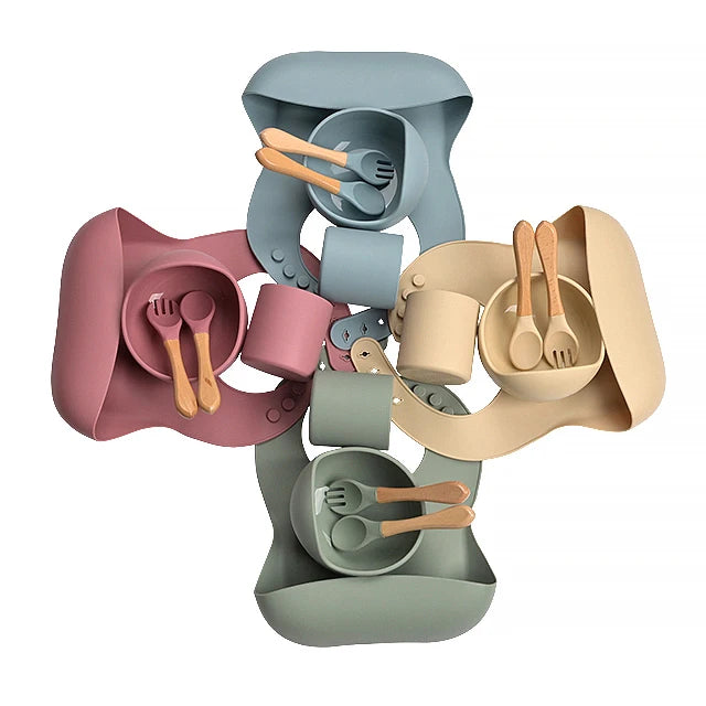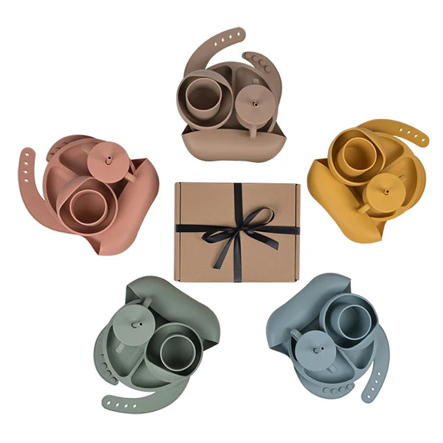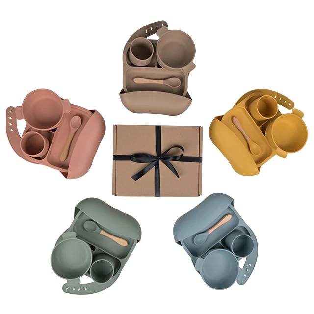 BPA Free Non Toxic Children Dishes Utenisl Dinnerware Kid Tableware Silicone Baby Feeding Set Suction Silicone Bib Bowl Plate